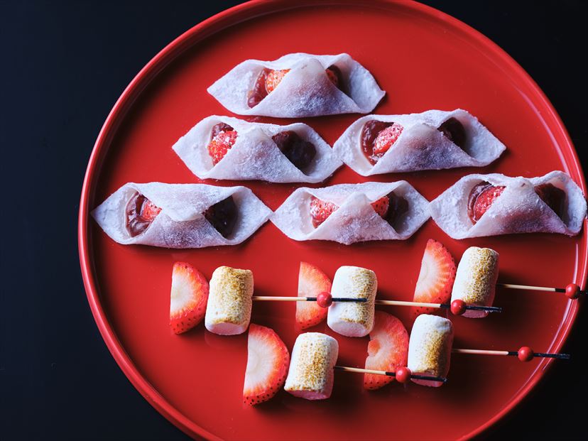 ▲ストロベリームースとコンポ―ト(上) ストロベリーとリコッタチーズのパイ、バルサミコチョコレート(下)