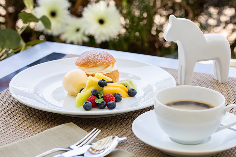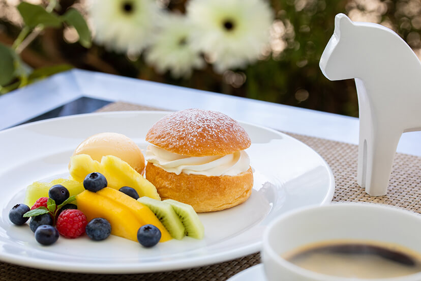 ・フィーカ ケーキセット 1,800円★新メニュー 中身がくり抜かれたカルダモン味の甘いパンの中に、 アーモンドペーストを合わせたカスタードクリームとホイップクリームを入れたスウェーデンの伝統菓子セムラとコーヒーのセットです。 横に添えた自家製レシピのバニラアイスと色とりどりのフルーツと一緒にお楽しみいただけます。 |