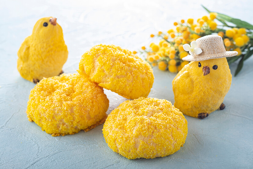 まるでミモザのような鮮やかな黄色の『ミモザ・レモンパン』は、 たっぷりの卵黄とバターを用いたブリオッシュをベースに、 レモンピールとココナッツを練り込んだクッキー生地で焼き上げました。 まるっとした可愛いフォルム、 そして甘さの後にほのかに感じるレモンの風味が爽やかなメロンパン風レモンパンです。