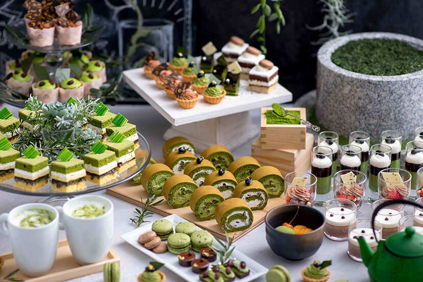 約20種類ものスイーツと、 様々なお食事メニューを楽しめるビュッフェに、 抹茶好きには堪らない、 抹茶葉のかけ放題をご用意!抹茶の原料となる、 宇治で精製された最高品質の「てん茶」や、 石臼を使い香り高く仕上げた「挽きたて抹茶」は、 どのスイーツやグルメにもマッチすること間違いなし!また、 上級の抹茶だけを使用した「あたたか濃厚抹茶ソース」をかければ、 口に入れた瞬間、 良質で上品な香りが広がります。