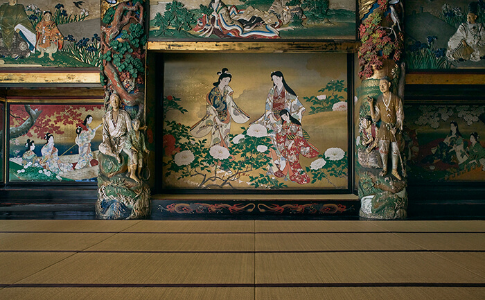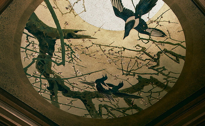 「百段階段」とは通称で、ホテル雅叙園東京の前身である目黒雅叙園3号館にあたり、1935(昭和10)年に建てられた当館で現存する唯一の木造建築です。食事を楽しみ、晴れやかな宴が行われた7部屋を、99段の長い階段廊下が築いています。階段は厚さが5㎝のケヤキ板を使用。階段で結ばれた各部屋はそれぞれ趣向が異なり、各部屋の天井や欄間には、当時屈指の著名な画家達が創り上げた美の世界が描かれています。