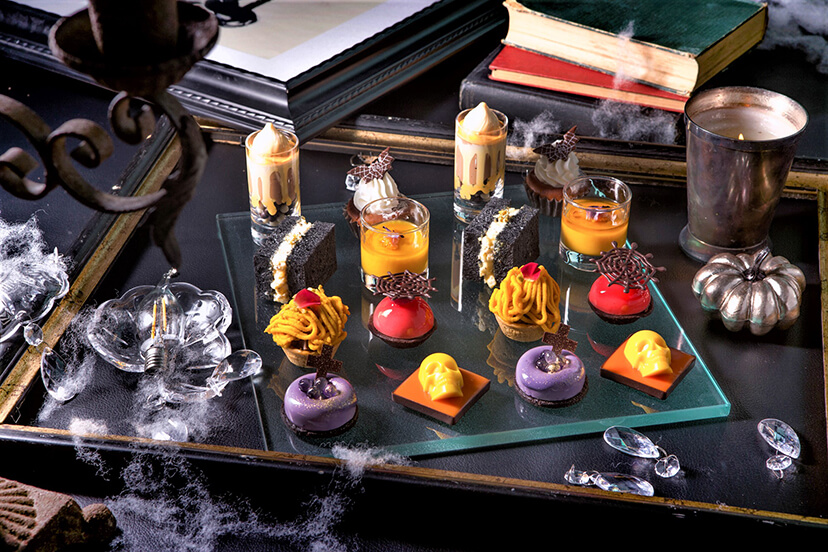 ホーンテッド・マナー ~ゴーストの館~の舞台は都心にありながら、 浜離宮庭園の緑を見下ろし、 東京湾が一望できるラグジュアリーな空間。 この館を模した空間に夜な夜な集い、 ハロウィンパーティーを繰り広げるのは、 昼間は暗闇で息をひそめるゴーストたち。 夜になると動き出すオバケやガイコツ、 怪しく揺らめくろうそくに照らされた蜘蛛の巣、 真夜中のパーティーで使われる妖しく華やかな仮面などをモチーフにしたミステリアスな雰囲気が漂うスイーツやセイボリーをご用意しました。