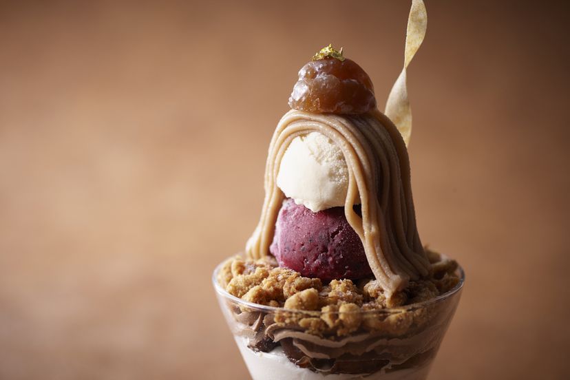 マロンクリームやパータフィロの流れるラインが印象的な「ウルトラマロン」は、刻んだ栗がアクセントのマロンムースやほくほくの渋皮煮、洋酒香るマロンアイスクリームなどが幾重もの層になっており、栗の魅力を存分に味わえる一品。マロンクリームの上には芳醇なフランス産マロングラッセをトッピングしました。リッチながらも優しい甘みが特徴の栗には、酸味が心地良いカシスのソルベとジュレに、香ばしくてほろ苦いほうじ茶のジュレ、そして濃厚なチョコレートクリームをペアリング。食べ進めるたびに栗の味わいがさらに広がります。洋酒の香りがほんのり漂う、華やかな大人向けのパフェの誕生です。