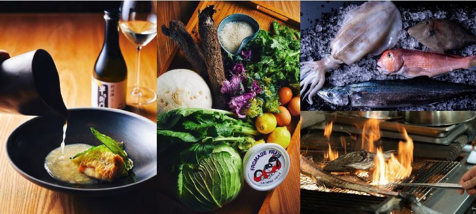 卵は京都の宇治の自然の中で、平飼いでのびのびと飼育されている「WABISUKE」の卵を使用。チーズは「神戸弓削牧場」で、出来るだけ牛の生態系に合わせて健康的な飼い方を大切にした牧場で取れたフレッシュチーズを取り入れた。また、通常は廃棄される魚の骨は、薪で臭みが無くなるまで焙ってから砕き、野菜と煮込んでソースに。野菜の皮はチップスにしたり、更には裏ごしして残った繊維をパウダーにしてお皿を彩ります。