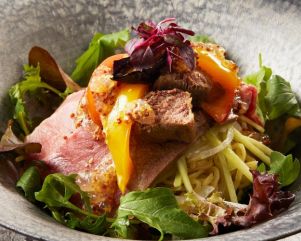 そして、今年新たに加わる「和牛冷しゃぶと夏野菜の特製冷やしそば」は、和牛のロース肉、牛タン、牛ほほ肉などを贅沢に冷しゃぶ仕立てにし、ナス、トマト、ピーマン、玉ねぎなどの夏野菜を合わせ、アマランサスの葉をトッピングしました。柔らかな肉の旨みと野菜のシャキシャキ感を、マスタードが程よく効いた醤油ベースの特製ダレでお楽しみいただきます。暑い季節には肉料理がお好みという方にぴったりな冷やし麺です。