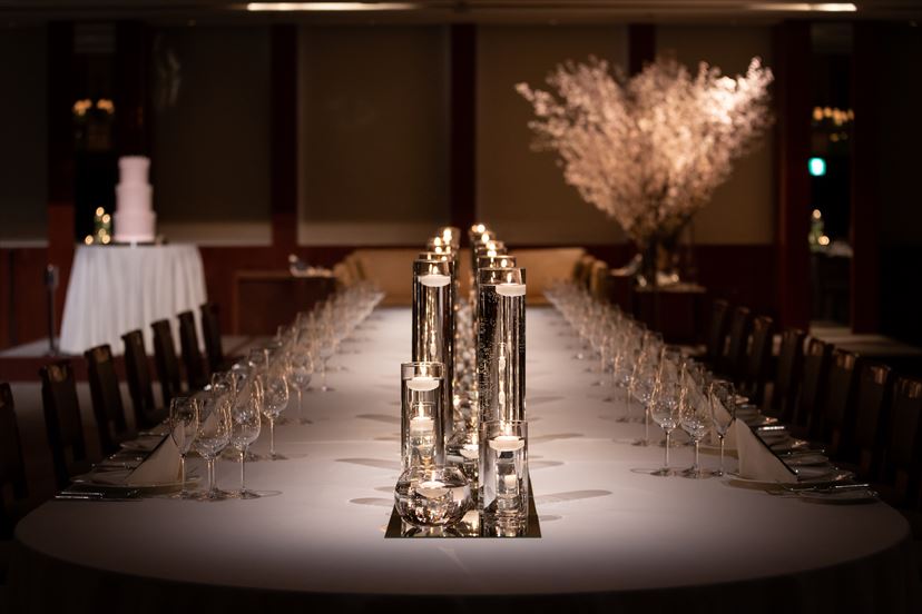 ロングテーブルはあえて装花をなくし、キャンドルのみに。下にはミラーを敷き、キャンドルの光が反射した幻想的な空間を実現できました。