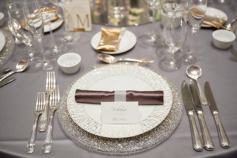 会場の内装デザインに合うようにテーブルクロスはグレー、ナプキンはワインレッド、キャンドルはゴールドに統一しました。
