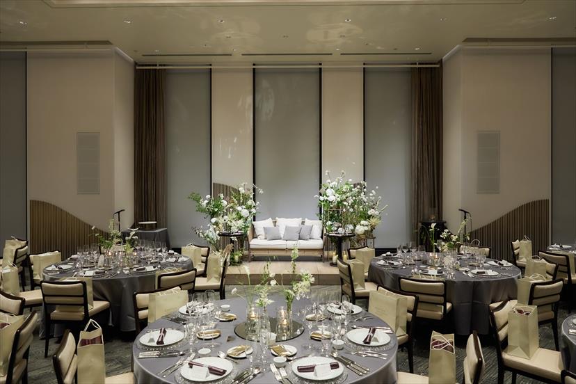 海外ドラマに出てきそうなお洒落な披露宴会場は、NYらしさ溢れる床から天井までの大きな窓のグリットがスタイリッシュで、天井の88個の照明がプレートやカトラリー、キャンドルに反射して会場全体をキラキラと見せてくれます。