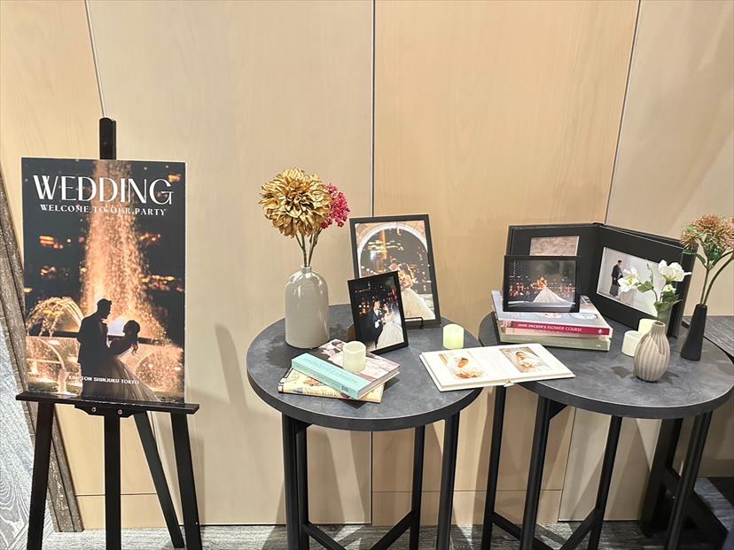 ウェルカムスペースもコンセプトを意識。黒縁の写真立てと高さ出しの洋書、ワインレッドとゴールドのアーティフィシャルフラワーでゲストをお迎えしました。お洒落だったとゲストからも好評でうれしかったです。