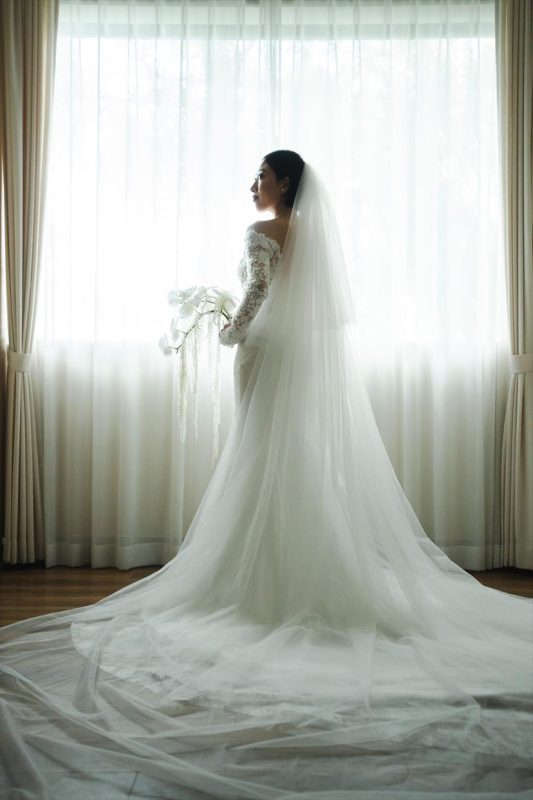 形がシンプルなドレスなので、上半身にはスパンコールをあしらい、ドレスとベールのトレーンは思いっきりロングにすることで、ゴージャスに。