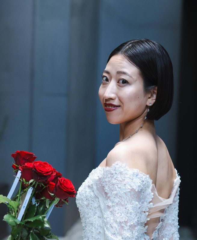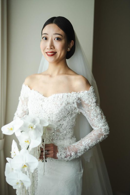 ドレスは身体にぴったりと沿うマーメイドタイプで、ラインの美しいドレスを目指しました。背中はオープンにすることでセクシーに大人っぽくしつつ、手首まで袖をつけることでセクシーになりすぎずという、上品さとセクシーさがちょうどよいバランスになるようにこだわりました!