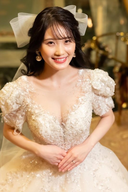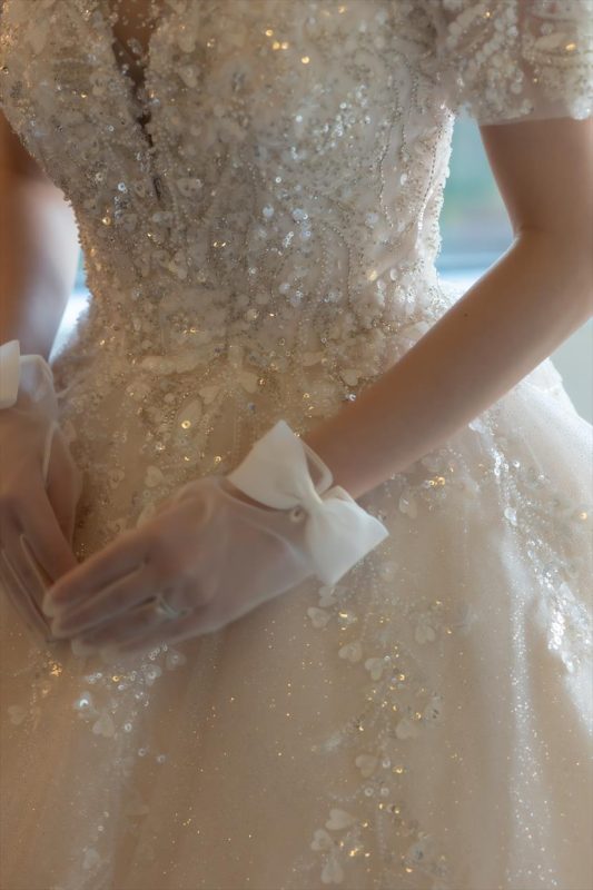 他の韓国ドレスは袖部分は切りっぱなしであることが多いと思いますが、このSAGAのドレスはパフスリーブ部分もビーズ刺繍で立体的に出来ており、このパフスリーブのおかげで完璧なプリンセスになれます…!現在このドレスは作られておらず、世界で1着という特別感も決め手になりました。