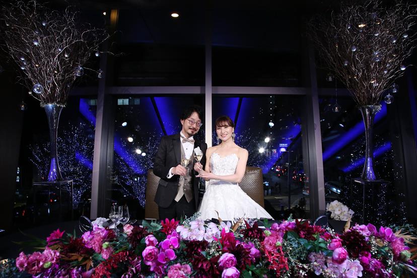 ゲスト卓は3種類用意して、スクリーンや高砂への目線を邪魔しないことをかなり重視して高低差をつけました。コリアンダーの会場は壁一面が窓でけやき坂のイルミネーションが見えます。毎年青なので映えるようにクロスなどのベースは黒にしたのが良かったです。