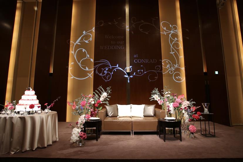 大人可愛い・NO昭和をキーワードに会場作りを進め、コンラッドでは珍しい高砂ソファを選びました。