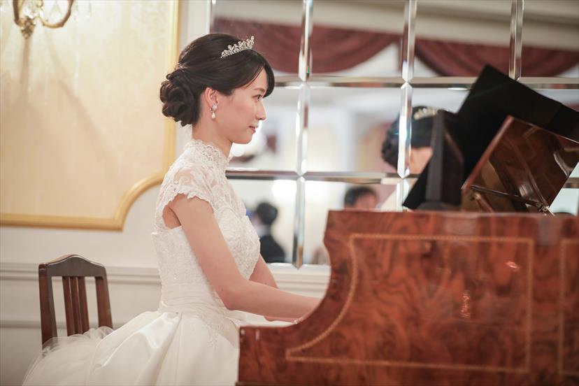 幼い頃から音楽に触れてきたので、人生の大切な節目である結婚式の日には、ウエディングドレスを着てピアノ演奏をしたいという夢がありました。そのため、ピアノが常設されているレストランを披露宴会場に選び、フルートを吹ける友人とアンサンブルを行いました。