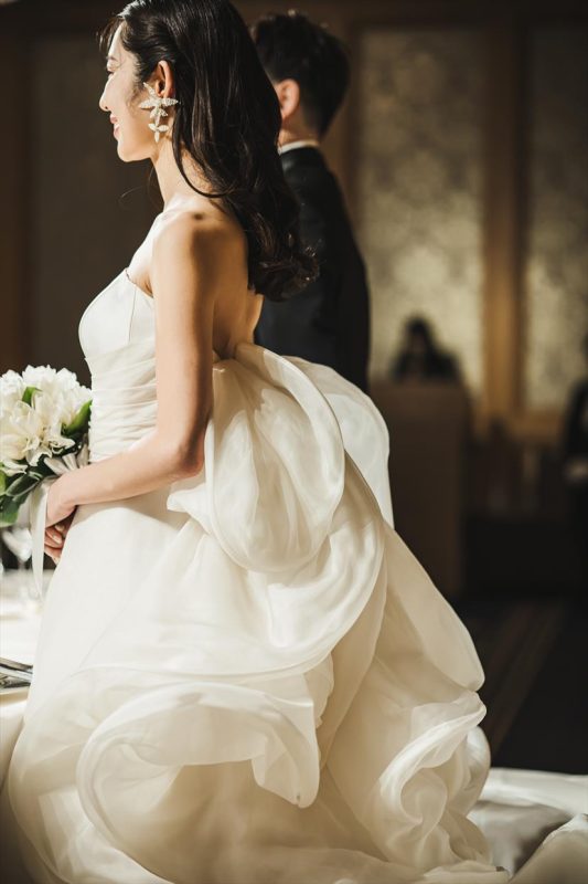 結婚する前から、結婚式をするなら他にはない美しい立体的なシルエットのANTONIO RIVAのドレスが着たいと思っていて、1番初めに着用したALESSANDRAに決めました。