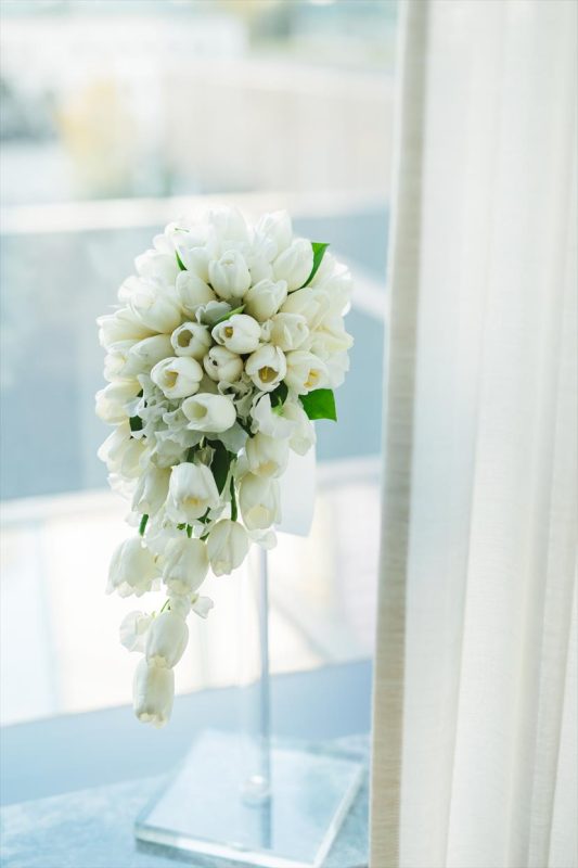 装花の中でも1番ブーケにこだわりました。私の大好きなお花であるチューリップのみを使ったキャスケードブーケをお願いしました。