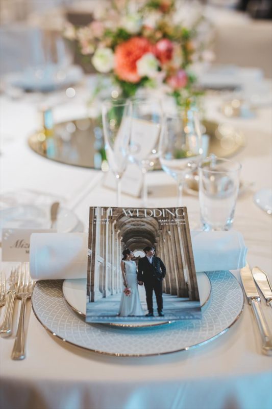 パリでの前撮りの写真をたっぷりと使っていただき、テーブルコーディネートや装花の色味と合うような表紙の写真を選びました。また、2人のプロフィールやQ&Aのページも作りゲストの方々により私たちのことを知っていただけるようにしました。