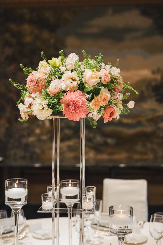 また、会場装花についてはコーラル系のお花をメインにグリーンを少し加えていただきました。お花とグリーンの比率や、全体的にキャンドルを多く使うことにこだわりました。