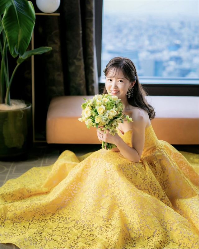 イエロードレスを中心に試着をしていたものの、オレンジ色に近かったり、蛍光色ぽかったりとなかなか理想のドレスと出会うことができず、、カラードレスが決まった時はとっても安心しました笑