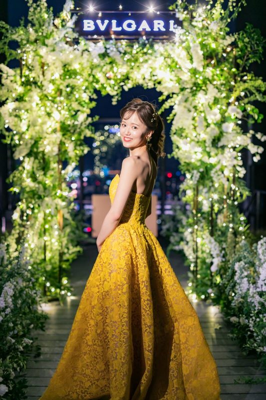 明るく華やかで圧倒的主役感があることや肌馴染みも良く、トーンを明るく見せてくれること、ブルガリ ホテル 東京のシックでモダンな雰囲気にもぴったりなところがお気に入りポイントです。