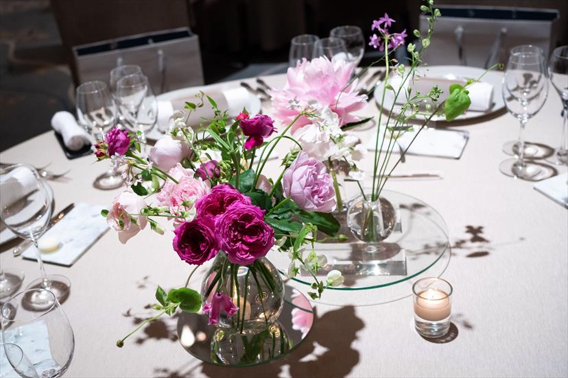 ピンクと透明感をキーワードに、大好きなピオニーを沢山使いながら幼くならない、今流行りの韓国風の抜け感をイメージした装花になる様に担当の方と相談を重ねました。