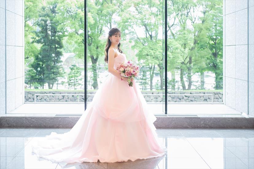 ピンクのドレスはそもそもの数が少なめで、青みピンク系のドレスはさらに少なく、せっかくならウエディングドレス同様にオーダーメイドで作ろうと製作しました。