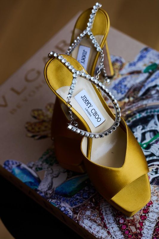 ドレスが2着とも白だったので、ウェディングシューズには鮮やかなカラーを取り入れたいと思い、プライベートでも良くはいているジミーチュウで、結婚式のテーマフラワーでもあったひまわりと同じ色のSaedaを取り寄せました。