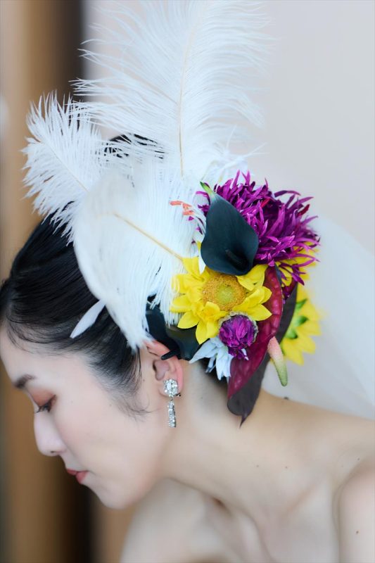 特に、挙式と披露宴の前半で着用した色鮮やかなヘッドピースは、半年以上前からデザイナーさんと何度も打ち合わせを重ねてフルオーダーで作っていただいたもので、本当にお気に入りです。