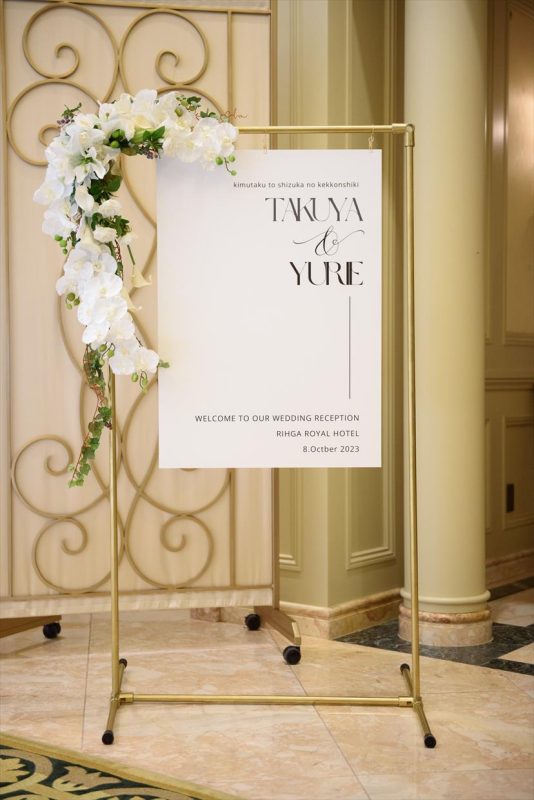 海外のロイヤルウェディング感をテーマにアイテムやグッズを作成しました。また、前室の雰囲気が良かったため、ウェルカムスペースの空間作りにもこだわりました。
