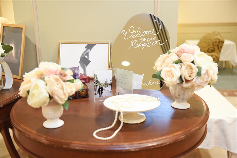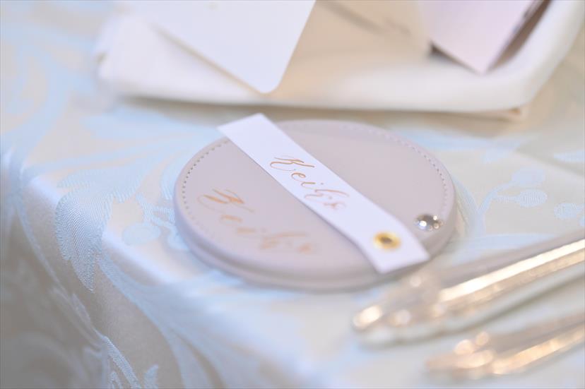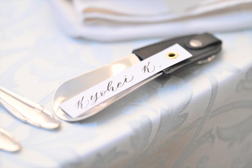 テーブルコーディネートに合うようにゲストにはカリグラフィーで名前が書かれたミラーや靴べらをプチギフトとして配置し、プレゼントとしても非常に満足度が高かったです。