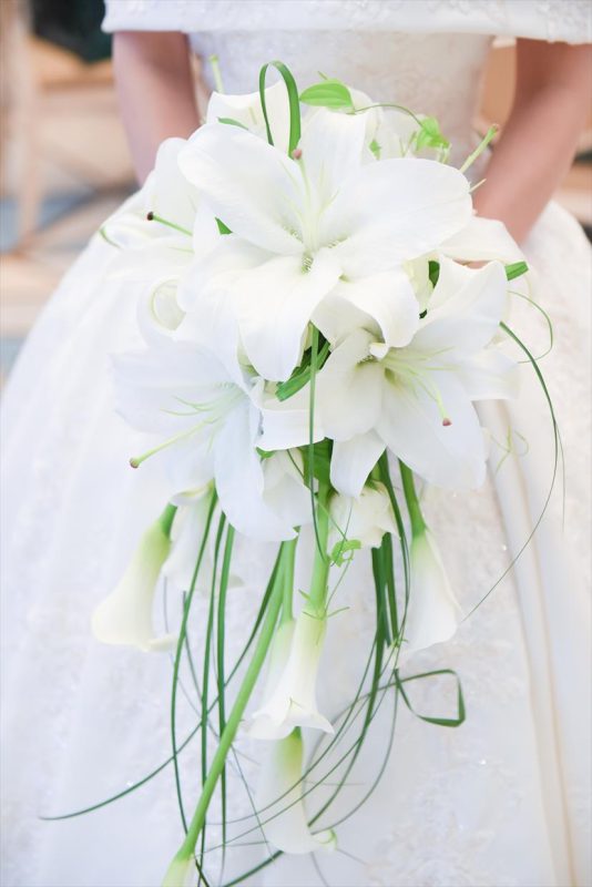 ブーケについては、ウェディングドレスは百合とカラーで王道にまとめながら、個性的に仕上げてもらうようデザインをリクエストしました。