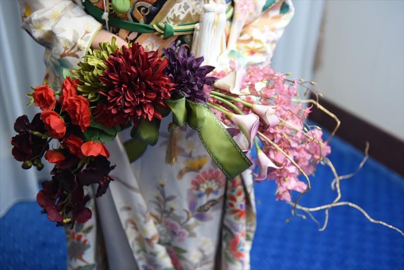和装は母がバレリーナブーケをアーティフィシャルフラワーで作りました。配色は引き振袖に合うように、でも和のデザインになりすぎないように工夫しました。