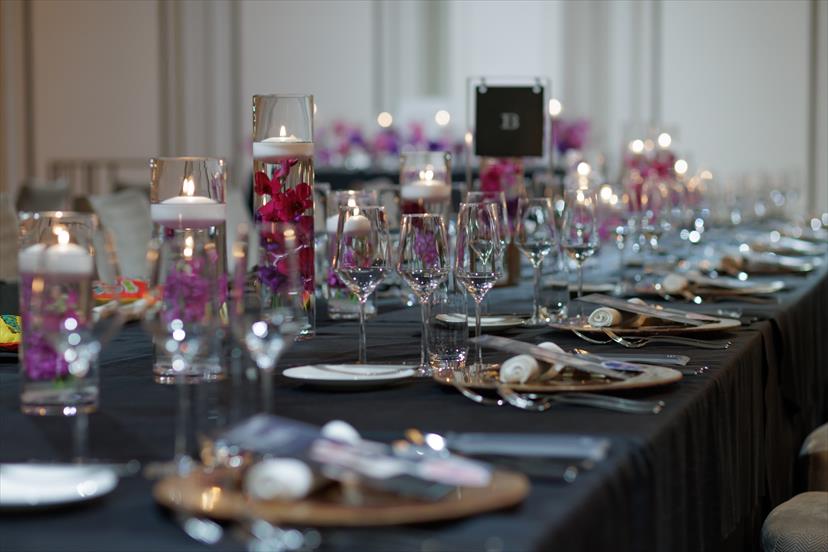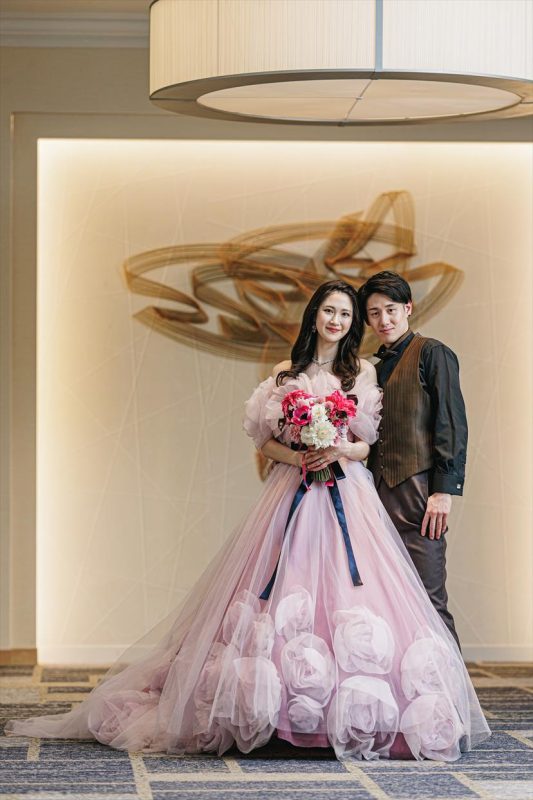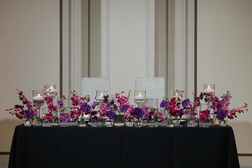 ブラック×ピンクでドレスに合わせて大人っぽいけど可愛い世界観を作りたかったので、フローリストの方と何度も打ち合わせをして、水中花なども混ぜながら理想の装花になりました。