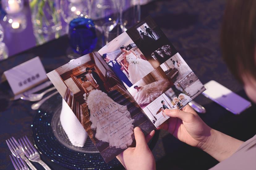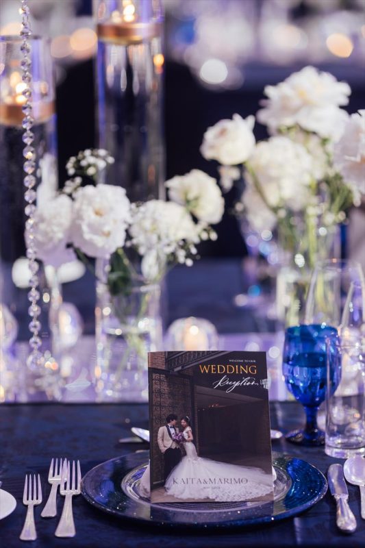 テーブルコーディネートの一環でテーブルクロスはネイビーにしたかったのでプロフィールブックの表紙は背景が暗めな写真を選びました。