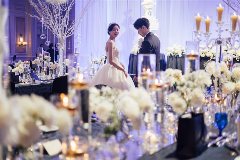 晩餐会の雰囲気を出すために、中央の2列は正餐テーブルに、周りのテーブルは円卓にしました。お花の色は白で統一し、種類を変えることで変化をつけました。