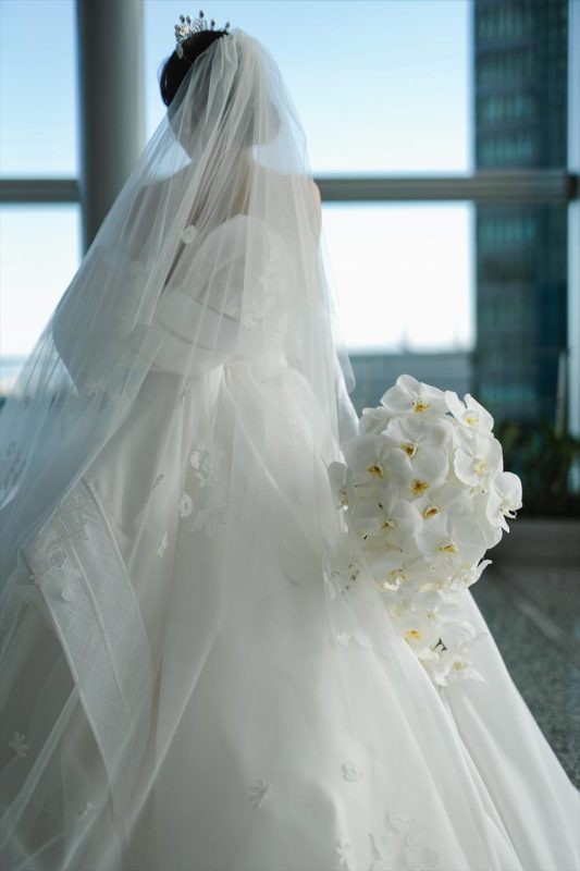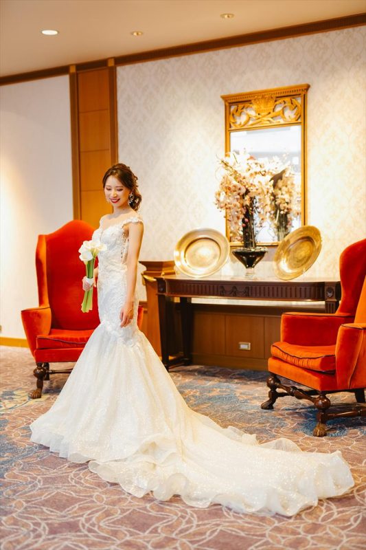 アントニオは挙式から披露宴にかけて着用。ホテル婚らしく、また広めの会場に合うよう王道のプリンセスラインを選びました。