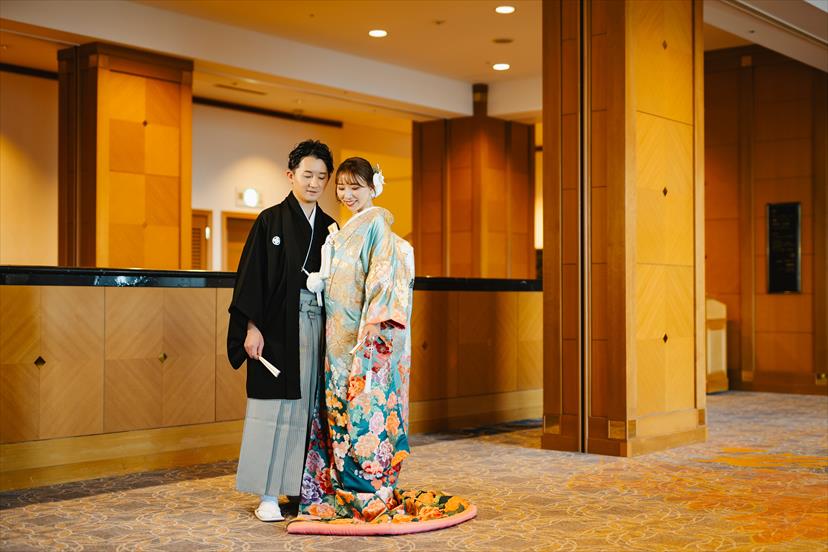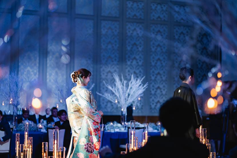 3着目を着るか迷いましたが、色打掛も残したくて、王道の赤ではなく、青と白でまとめられた会場にマッチするよう水色にしました。