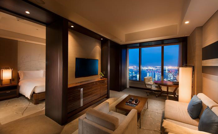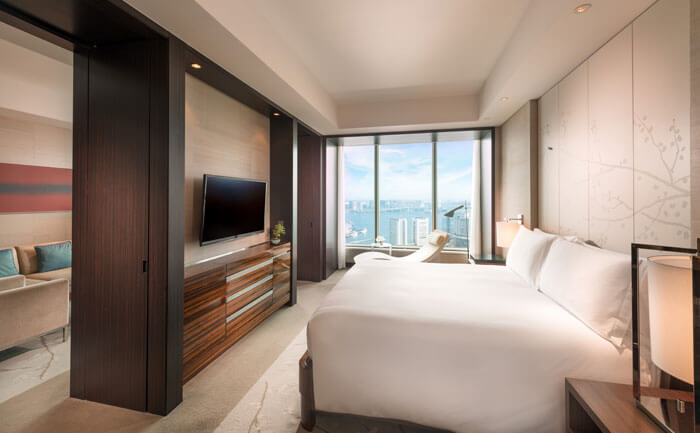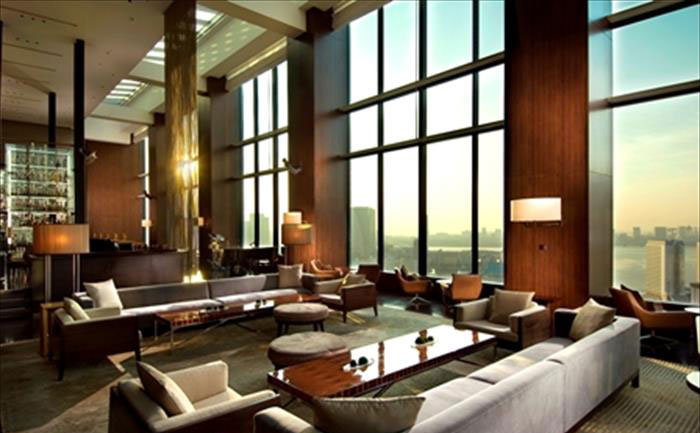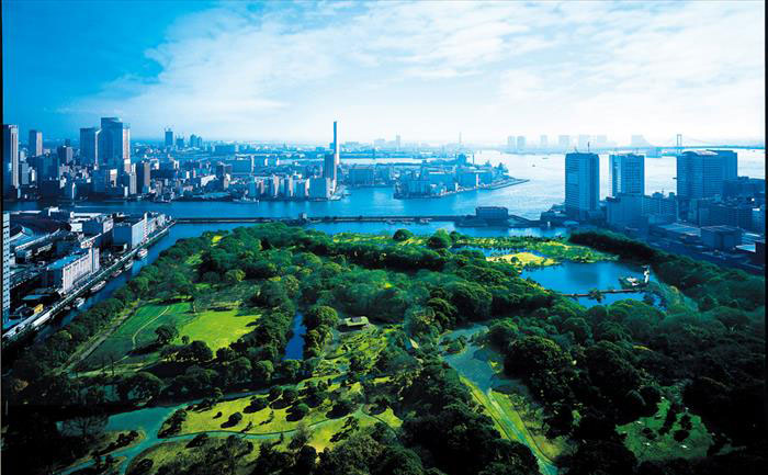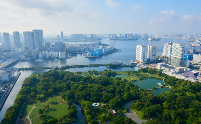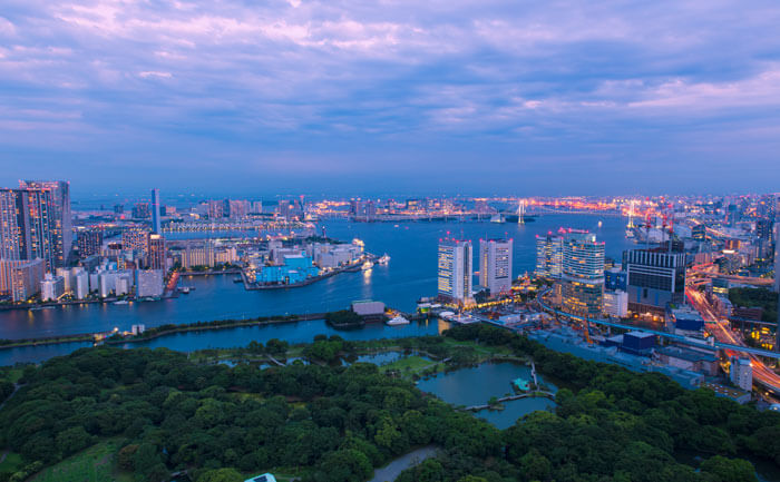 銀座からほど近い汐留に位置し、東京湾とふもとに広がる浜離宮恩賜庭園の豊かな緑を望む雄大な景色に出合える。