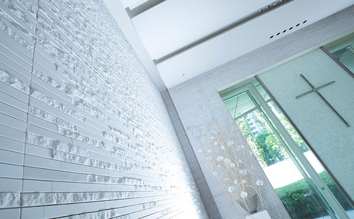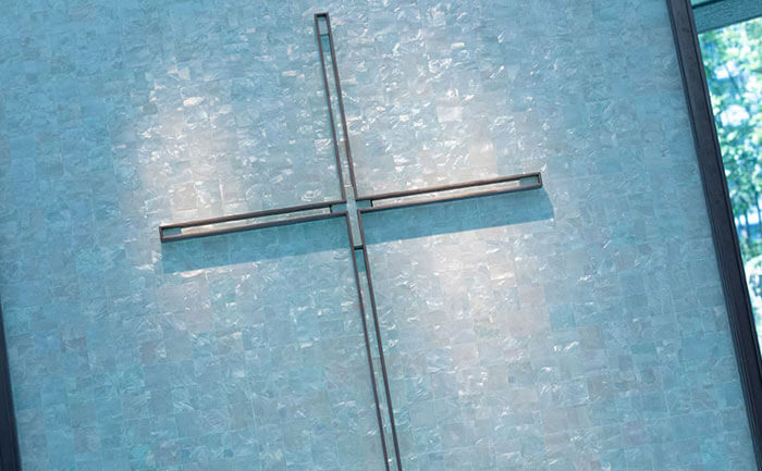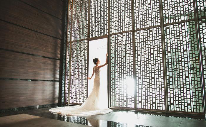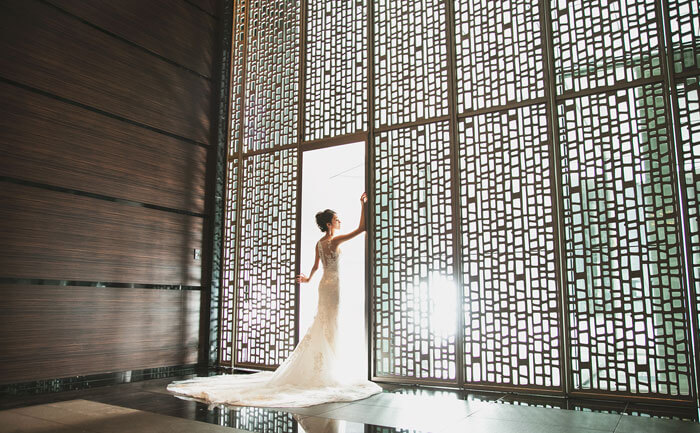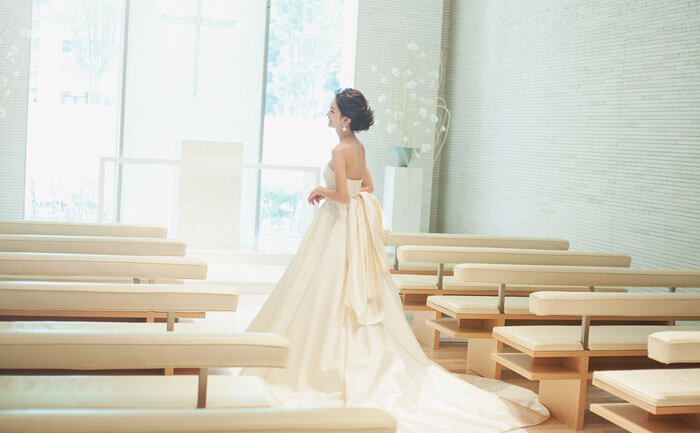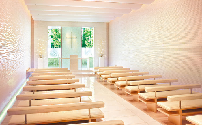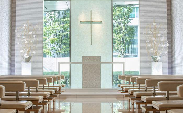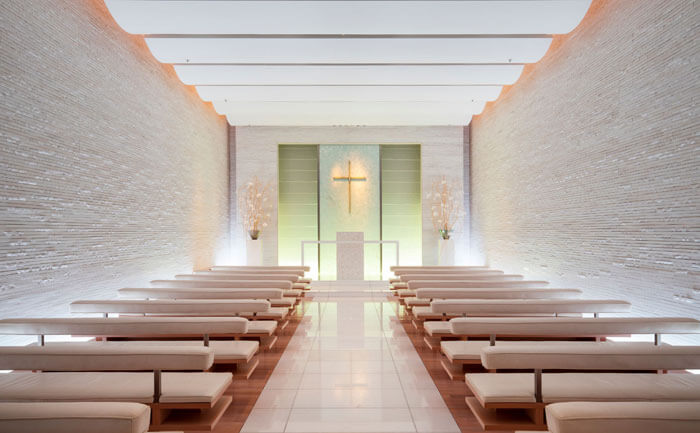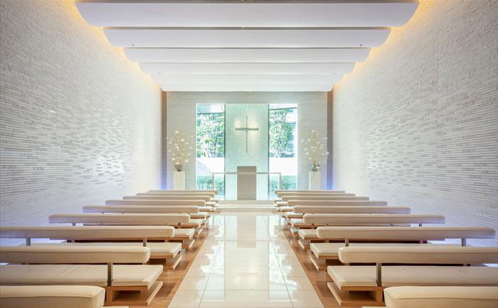 自然光が明るく降り注いで、ふたりを包み込み、水面に雪が降り積もるような、神秘的なチャペル。静寂の中に感動が浮かれ、忘れられない思い出に。