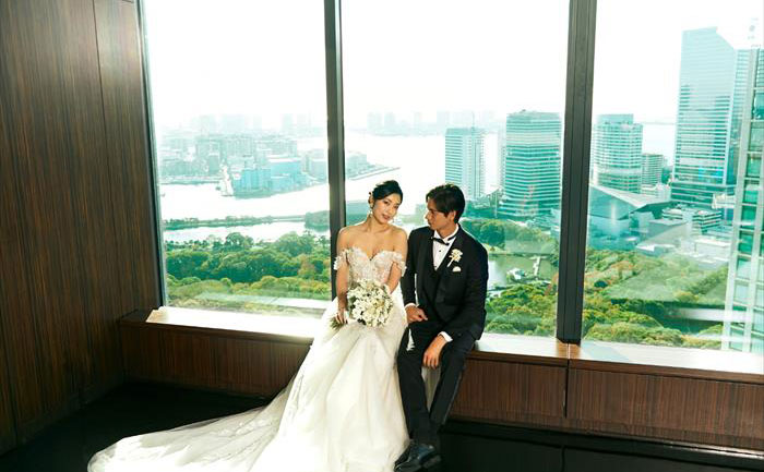 エントランスのロゴ前のスポットは、フォトシューティングにおすすめのロケーション。ホテルは銀座からほど近い汐留に位置し、東京湾とふもとに広がる浜離宮恩賜庭園の豊かな緑を望む雄大な景色に出合える。