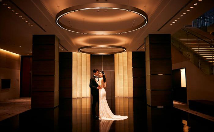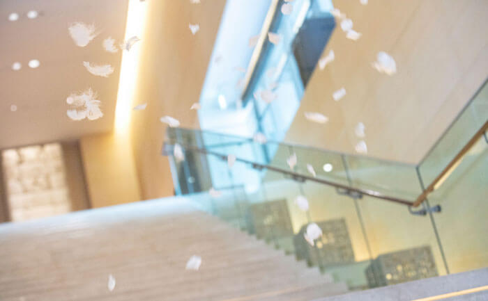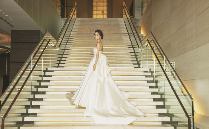 大階段でのドレスショットはフォトジェニックにこだわる花嫁の憧れ!館内は和のモダンアートが飾られ、洗練された雰囲気が広がる。日本の現代美術アーティストの作品が随所に配されており、美術館に訪れたような気分になれる。