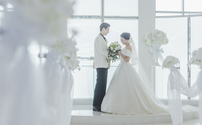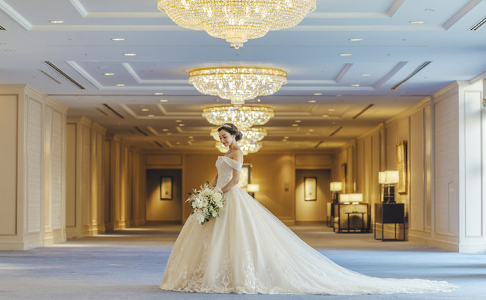 絵画や調度品が並ぶ広々としたホワイエではシャンデリアの煌めきと自然光で花嫁を美しく際立たせる。
