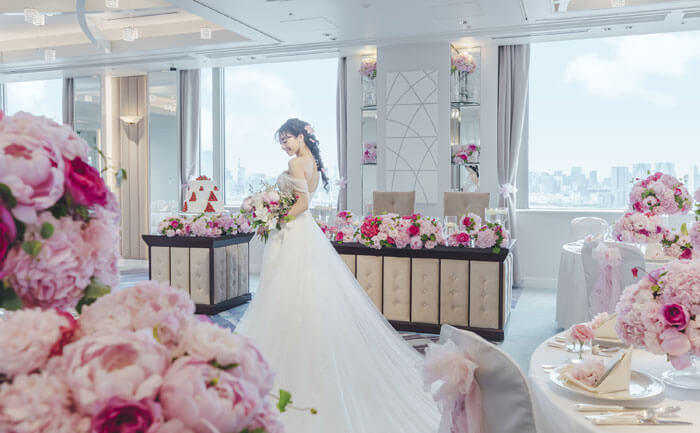 披露宴は「スカイビューウエディング」に注目。地上100mの高層階会場は、窓に広がる絶景もゲストへのサプライズ。そのほか、天井高8mのシャンデリアが煌く格調高いボールルーム風のバンケットや、少人数におすすめのパーティルームやロイヤルスイートルームなど多彩に選べる。