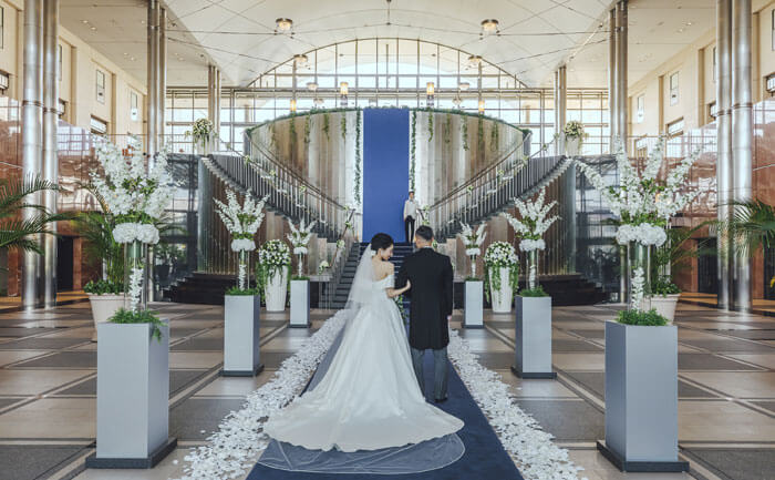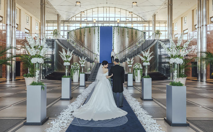 サファイアブルーのウエディングロードと大階段が印象的なアトリウムチャペル「グランデュール」。