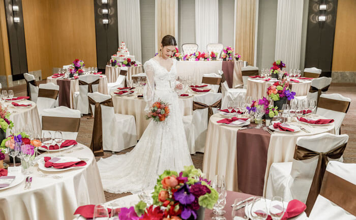 ヒルトン大阪は梅田のランドマーク的な存在。洗練された雰囲気の中、世界ブランド「ヒルトン」ならではのホスピタリティでゲストを温かくお迎えしてくれる。アクセスの良さも、お迎えするゲストへの安心感に。7階オープンスペースの人気の「アクア・ゴールドチャペル」はシンプルでスタイリッシュな空間。光溢れる庭園で、たくさんの祝福と笑顔に包まれる幸せいっぱいの挙式を叶えて。披露宴会場はスカイバンケットなど人数に合わせて多彩に選べ、ヒルトンが誇る芸術的な美しさの料理も大好評。
