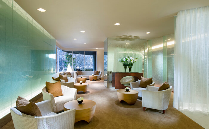 大きな窓から臨む緑と、江戸の粋をテーマに統一されたインテリアがモダンなラウンジは絶好の撮影スポット。