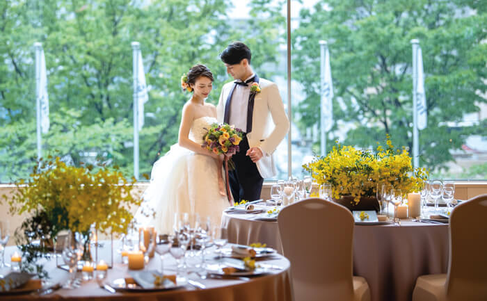 大きな窓から明るい自然光が差し込み、新緑の並木や新宿都庁などの景色も眺められる披露宴会場「桜の間」。