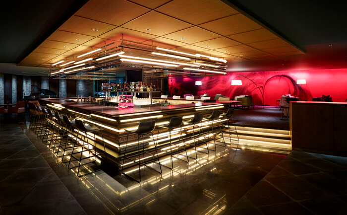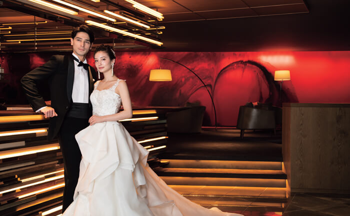 「バー&ラウンジZATTA」深紅の壁や光の層が織成すバーカウンターは、ドレスが際立つ人気のフォトスポット