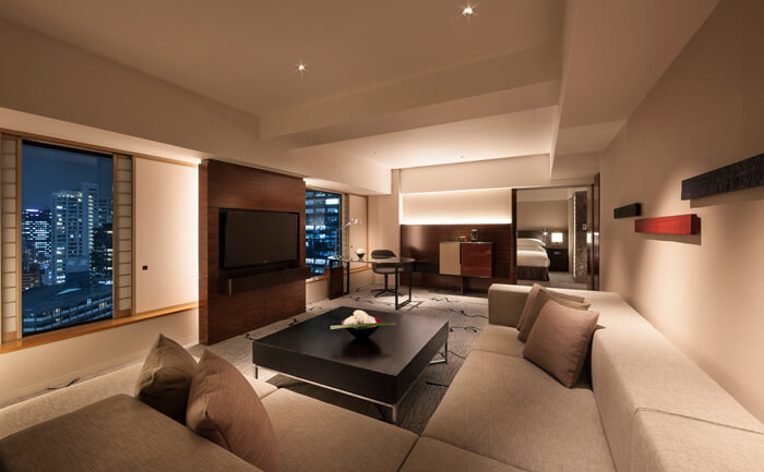 縞目の着物や帯にインスパイアされた和の意匠を活かしたインテリア。モダンな空間で優雅に寛ぐひとときを。